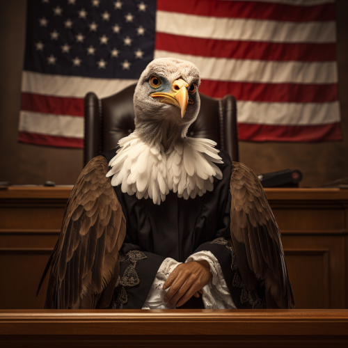 AI taking over legal professions, futuristic courtroom, holographic displays of case files, an advanced AI robot in judge's attire, deliberating over cases. Dim courtroom lighting with spotlights on AI, sharp contrast, metallic surfaces reflecting light, deep blues and purples --ar 2:3 --v 6.0