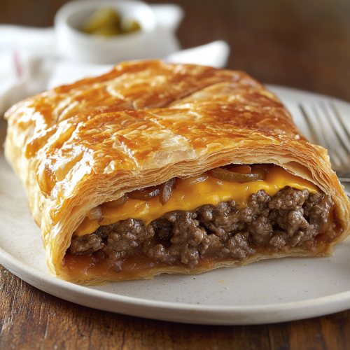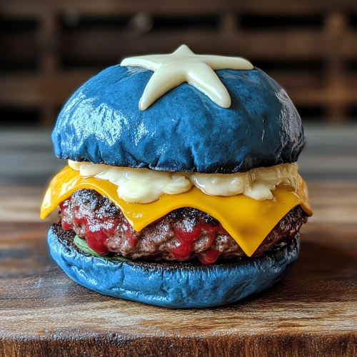 recreate a burger with a blue top bun, a slice of melted white cheddar cheese, a red beefy patty, another slice of melty white cheddar cheese, and a blue bottom bun, a white star is seared into the top bun