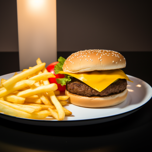 a plate with a cheeseburger and fries sitting on a bathroom scale, good lighting on food. close up image. --stylize 0