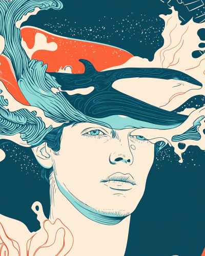 vector graphics in bauhaus style, art in art nouveau style, portrait a man and sea and big whale, suprematism, sharpen, color his eyes light blue with white, watermelon hair::3 --aspect 4:5