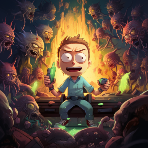 a chemist in biohazard gear pounding a maple tap into a huge redwood tree with sap oozing out of the tap. Theres a pile of white pvc pipes next to a tipped over box of butane canisters and an empty casserole dish on the ground. in the middle of a deep wooded forest - rick and morty art style
