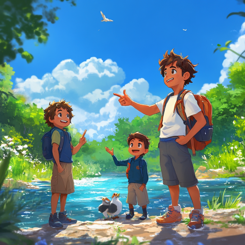 Romy stands confidently on one side of the river, pointing toward the opposite bank while explaining the high-jump challenge. His eyes are wide with excitement, and Niko stands beside him, cheering him on. Zane is standing on the other side of the river, looking skeptical but intrigued. The river sparkles in the background, and the sky is a clear blue with puffy clouds.