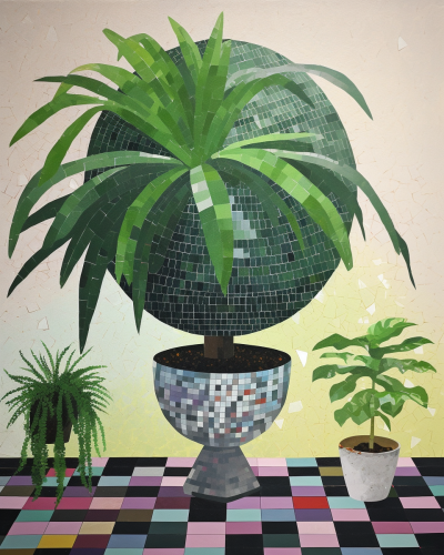 One minimal poster of giant disco ball turned into a planter with jungle plants in the style of Gary Bunt --ar 4:5 --v 5.0