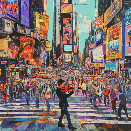 A bustling city intersection with people crossing from all directions, colorful billboards flashing, and a street performer playing a violin, all in a harmonious blend of urban chaos