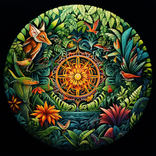 ultra realistic, ultra detailed, rpg map, jungle, without grid showing wooden temple in the middle of tropical jungle, wild, no grid, dark green, drawing --v 5.2 --ar 3:2