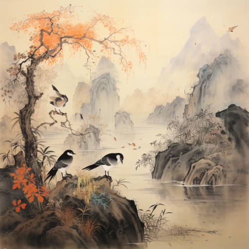Chinoiserie-inspired wallpaper with a pagoda, elephant, and tiger in a jungle landscape, with many birds flying in the sky. Detailed and high-resolution. --ar 16:9 --v 5.0