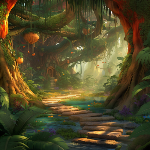 disney inspired jungle similar theme to Tarzan the animated movie, vibrant colours, tree canopies