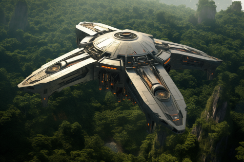 Futuristic spaceship taking off from the jungle with small temporary spaceport buildings in the forest background, birds eye view, worn, old, sci-fi, cinematic, comic book art --ar 6:4