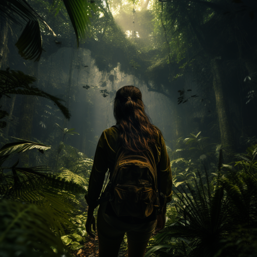 cinematographic scene where a girl comes out of the jungle wearing green clothes