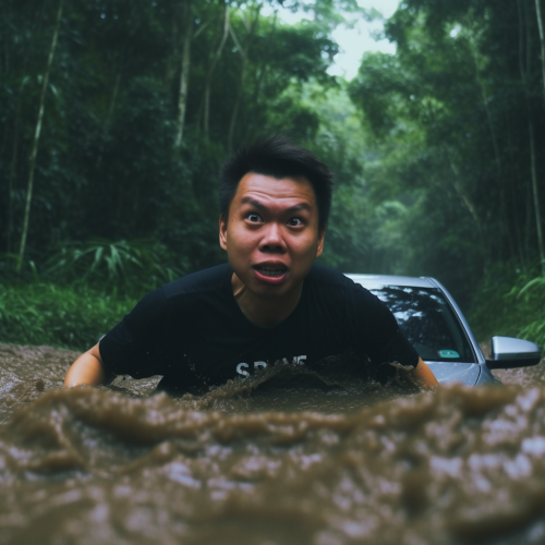 A vast, desolate borderland stretches to the horizon. The foreground is parched earth, cracked and thirsting. In the middle distance, the lush green wall of the Lacandón jungle rises abruptly, an impenetrable barrier. Dominating the scene: a weathered, larger-than-life motorcycle, half-buried in the arid soil. Its chrome is dulled, its leather worn. The bike is clearly American-made, a relic of another world. Emerging from the motorcycle's shadow: a young woman's silhouette. Her stance is defiant, one hand clenched at her side, the other reaching towards the jungle. Her blonde hair catches the last rays of a setting sun. The sky above is a canvas of violent beauty - deep crimsons and purples, with streaks of gold. These colors reflect in the few remaining pieces of the motorcycle's chrome, creating an unsettling contrast. Carefully integrated details: A delicate string of Mayan glyphs etched into the motorcycle's fuel tank A discarded hypodermic needle glinting in the dust near the bike's wheels The faintest outline of a jaguar, almost mirage-like, at the jungle's edge
