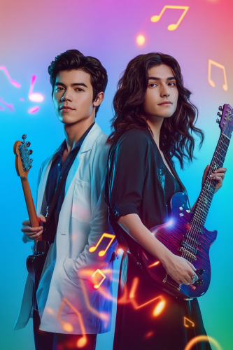 A promotional poster featuring two characters: a Thai engineer (Perth Nakhun Screaigh) with short, neatly styled dark hair, a serious expression, and wearing a lab coat, standing opposite an American musician (David Archuleta) with medium-length wavy dark hair, dressed casually with a guitar. A vibrant magnetic field with flowing musical notes connects them, symbolizing attraction and resonance. The background is a gradient of soft blues and magnetic reds, with the engineer calm and reserved, while the musician is more expressive. --ar 2:3