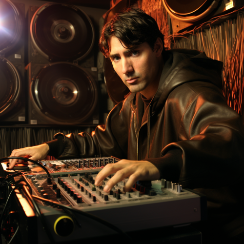 musican working in a studio session with microphone, realistic photographic, 35 mm lense cinematic style shot in the style of Roger Deakins Cinematography