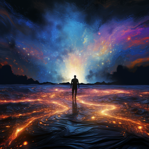 a man walking in landscape of iceland pouring rain, 4k, ultra - detailed, hyperrrealistic Beautiful digital art of a holographic majestic, blue raging fire, Black and gold full body, vibrant fire, vibrant lights, swirls, vibrant colors, bioluminescent translucid