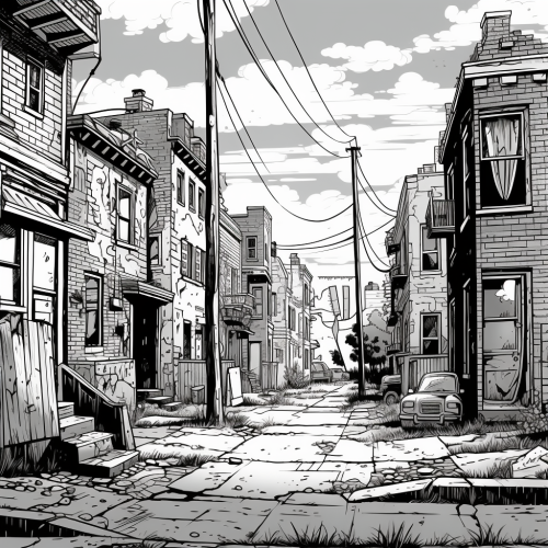 new paper panel comic style balck and white sketch backgrounds of cartoonish urban neighborhoods from a profile view similar to a side scroller video game but in a style closer to Robert crumb, be sure to add a slightly rustic and disheveled charm to the aesthetic of the neighborhood with minimal trash and make the scene alive by giving various inanimate objects mischievous cartoonish faces