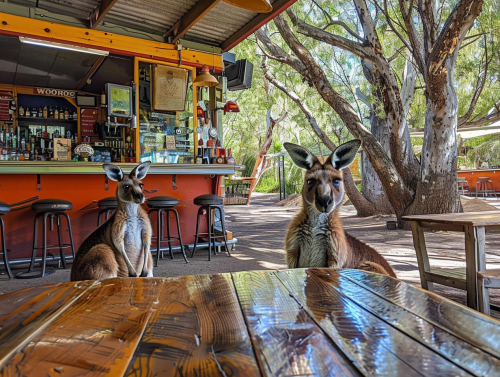 view from a table in a bar that has kangaroo bar tenders and patrons , australia, view of bar --ar 4:3 --style raw --v 6.0