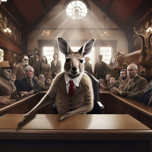 HD 4K photorealistic movie scene. A kangaroo court. The judge is a kangaroo, the jury are all kangaroos. Standing trial is donald trump