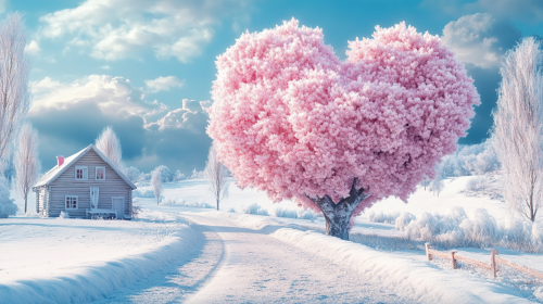 This is a beautiful snowscape. There is a snowy road. Beside the road, there is a warm little house. There is a super large pink heart-shaped tree. A heart-shaped tree. Under the heart-shaped tree, there is also a warm little house. The snow is very thick. Front view. Ultra-wide-angle lens. --ar 16:9