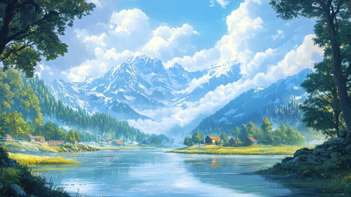 interlaken switzerland, turqouise color river, traditional swiss houses, stone bridge, flowers, sun with some clouds --ar 16:9