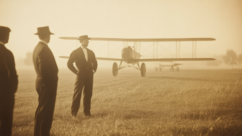 The Wright Brothers standing next to their first plane, discussing flight plans with their team, detailed historical photo, early 1900s airfield, sepia tones, asymmetrical composition, morning light with moderate shadows, early airplane prototypes in the background --ar 16:9