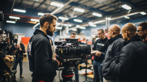 dslr super realistic photograph, shot on 35mm camera, wide angle, from some meters away diverse karate fighters, carining laptops and pen and paper, conference, practicing, coding, planing, highly technical --ar 16:9 --s 750 --v 5.2