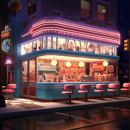 Style of Pixar Kidsmovie Animation: American Diner in the 50's from the Inside, Bar for Milkshakes, 1950s cars outside of the window