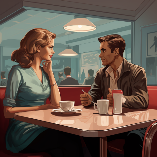 Imagine you're transported back to the vibrant era of 1980. You find yourself in a bustling diner, mid-journey, surrounded by the sights and sounds of the time. The jukebox plays hits from the likes of Queen and Michael Jackson, while neon lights flicker overhead. As you settle into a booth, the waitress hands you a menu filled with classic dishes of the era – think burgers piled high with toppings, hearty sandwiches, and indulgent milkshakes. Describe the scene around you as you observe fellow travelers, each enjoying their meal in the midst of their own journeys. What conversations are taking place? What nostalgic aromas fill the air? Dive into the experience of dining in 1980, capturing the essence of a moment frozen in time, realistic pic, rustic image
