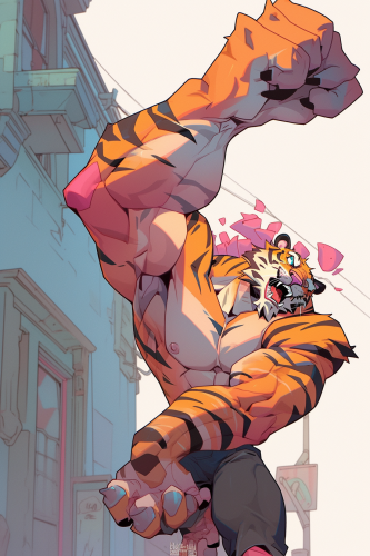 Anthro tiger Fursona Flexing His Biceps, anodized Bright bold colors, character design, cartoon, stalinist architecture, furry, drone photography --niji 5 --style expressive --ar 2:3