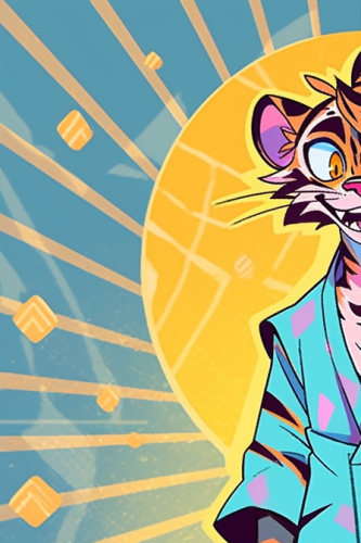 Anthro tiger furry cyberpunk superhero fursona wearing blue biker jumpsuit in Cartoon , lineless, samurai jack, charley harper style --v 5.2 --ar 9:16