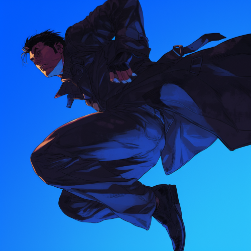 kazuya from tekken wearing a black trenchcoat jumping, anime cell, cell shaded, digital color, line work visible, ultradetailed --niji 6