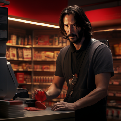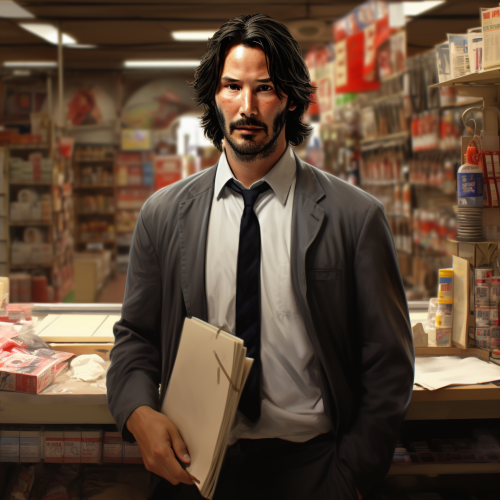 GTA 5 loading screen freaturing Keanu Reeves, typical art work --ar 16:9 --v 6.0