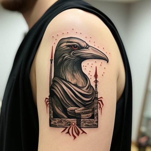 classic style tattoo of a Kenku from Dungeons and Dragons, with a blank script