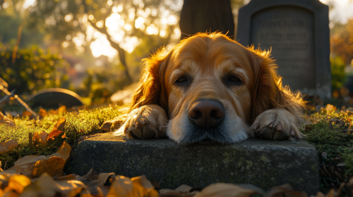 imaging ultra photorealistic 8k image showcasing the old golden retriver extreme closeup laying and crying on the old man's grave --ar 16:9 --stylize 200