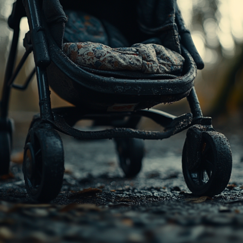 Ultra-realistic cinematic extreme close-up shot of a baby stroller, captured at ground level in IMAX style, very detailed and sharp in 4K resolution. Shot on 35mm film, emphasizing realistic textures and film grain, with dramatic lighting and depth. Highly realistic, lifelike details.