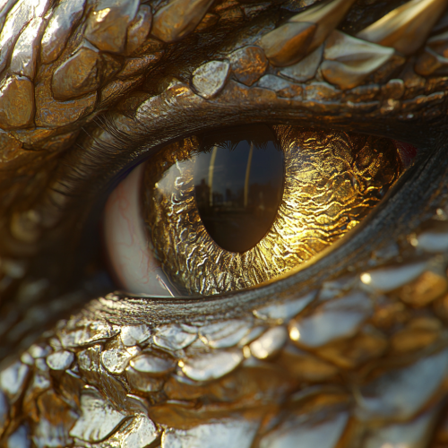 A close-up of an eye with scales and gold, in the style of a dragon. Hyper-realistic animal illustrations with smooth textures, hyper-detailed and cinematic. Rendered using Octane Render in Cinema 4D, showcasing hyper-realistic and ultra-realistic details, intricate textures, and volumetric lighting with ambient occlusion and volumetric blur. 8K