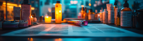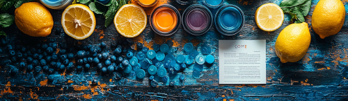 realistic photograph, of a table, seen up close and from above, with lots of products spread out, in a mess on the table, next to it, a page of a well-organized catalog article, with a color filter, blue and purple, and yellow green lemon electric --ar 127:37 --q 2 --s 750