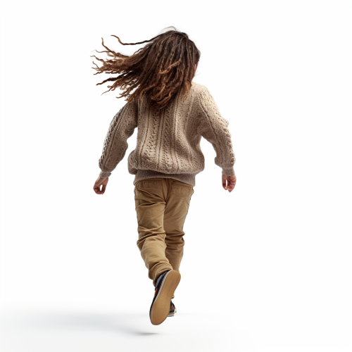 kid with dreads running, boy, isolated white background, realistic 4k, rear point of view, shot from behind, straight rear point of view, shot from exactly behind the object, wearing sweater and long pants