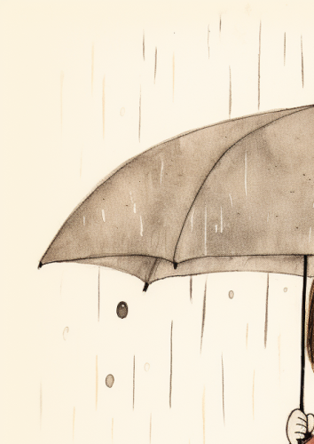 draw a man with an opened umbrella. the man has short dark brown hayr with a few whit strands of hair. also a goatee. the man wears brown glasses. he is looking to the umbrella witha happy face
