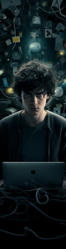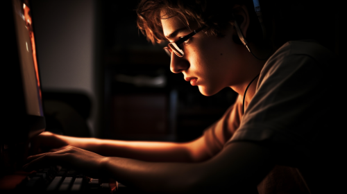 photo of a teenager playing computer, use colors Soft Ivory and Deep Crimson and Vibrant Tangerine and Midnight Blue, photorealistic fantasies, sigma 85mm f/1.4 dg hsm art, monumental, expressive --ar 16:9 --v 5.0