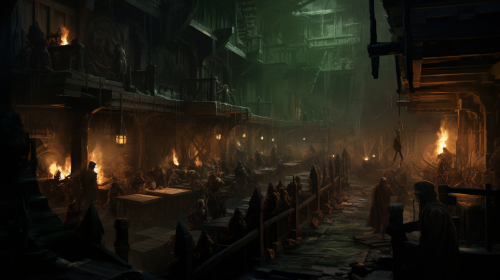 interior of a crowded gaming house in a dark fantasy world. Humans, Elves, and Dwarves. Smoky. Painted. --ar 16:9