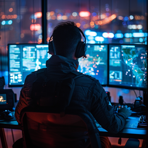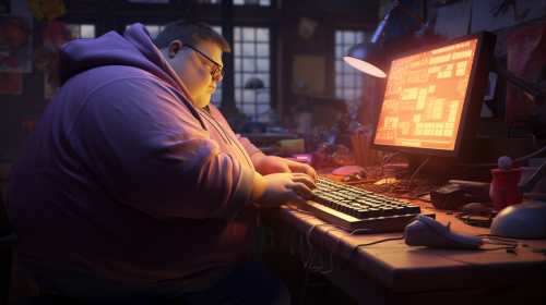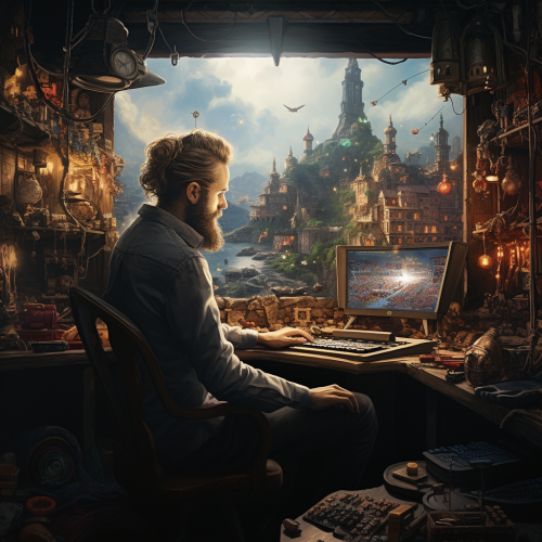 Picture of someone from the back doing prompt on his computer on midjourney at night, we see the exact same described picture on the screen of his desktop, mise en abime