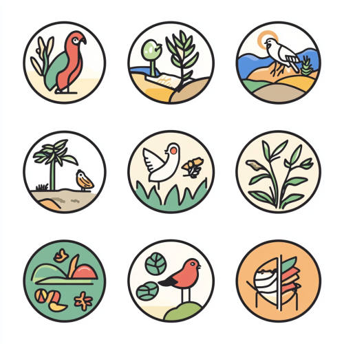 illustrative icons for the Natural History Museum of Los Angeles nature gardens. abstracted in their simplest form. simplified. in a circle, they have to be simple icons, like for an app. natural colors that evoke both organic and the urban nature of Los Angeles. make many different ones. use line.