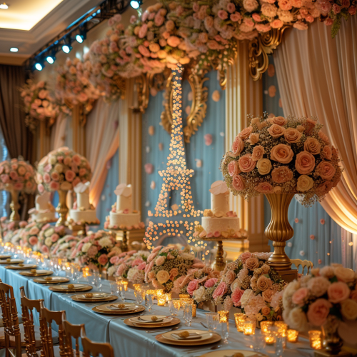 first birthday party set up with huge hall to decorate with paris theme, many tables with paris theme, big stage with paris theme, flowers all around the venue --s 750 --v 6.0