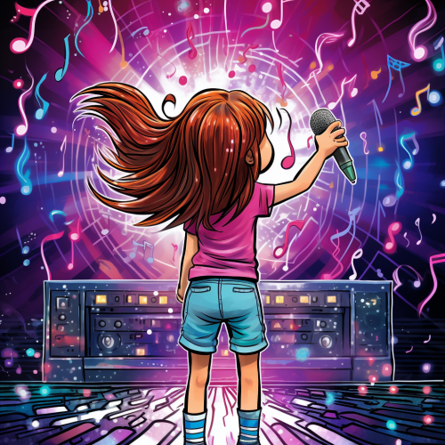 A party invitation of a 9 year old chestnut hair girl backside singing along in front of a karaoke screeen fill with glittery musical notes. Draw it in posca markers cartoon style. Fucsia, blue, purple,white, pink and black colors, detailed lines, raw