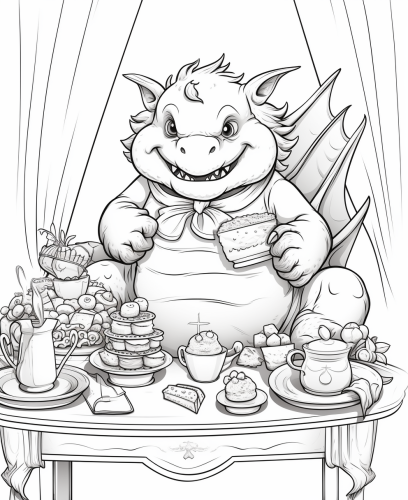 coloring page for kids dragon hosting a tea party with various mythical creatures and laughter. , cartoon style, thick lines, low detail, no shading --ar 9:11