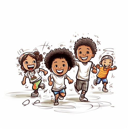 kids playing, hand drawn line art style, diary of a whimpy kid style drawing, African Americans, white background
