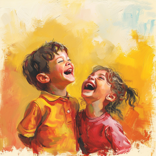 2 kids laughing at a joke illustration from a kids book, yellow and red colors, illustration --v 6.0