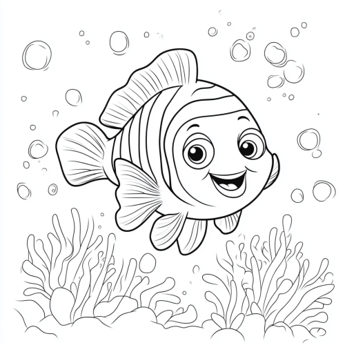 coloring page for kids,a cute clownfish ,cartoon style, thick lines, low detail,no shading ,Dreamlike, Art style in the manner of a disney film , bright image.