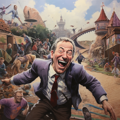 A squirrel driving a miniature train full of stupid human kids in a municipal amusement park during the golden hour. Use canon EOS f/16 aperture. Have the squirrel look annoyed that he has to work like this --chaos 40 --ar 3:2 --v 6.1
