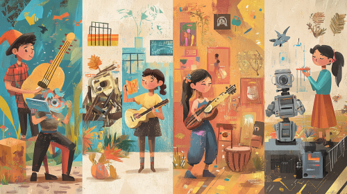 illustration, folk art style, in 4 quadrants, tween from various cultures doing various projects, in one corner playing an instrument, in another painting, in another buildling a robot and in the last corner cooking, #023047 #3A72C5 #219EBC #3A469C #878EB4 #9C68A6 #510276 #E398A9 #CA2E55 #E65C39 #FE8405 #E65C39 #FE8405 #F7B538 #FAED95 #FFF6DF, magical, whimsical --ar 16:9