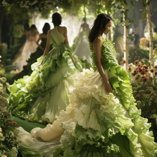 A fashion runway event where models walk in flowing gowns made entirely of lettuce leaves, the fabric-like quality of the leaves creating an ethereal effect. The dresses sway and ripple as the models move, with each outfit featuring subtle variations in leaf color from deep green to pale yellow. The runway is designed to look like a garden, with soft green lighting and floral arrangements in the background to complement the natural theme. Created Using: ethereal fashion design, natural material innovation, soft focus photography, gentle lighting, emphasis on movement and flow, harmonious color palette, botanical fashion inspiration --v 6.0